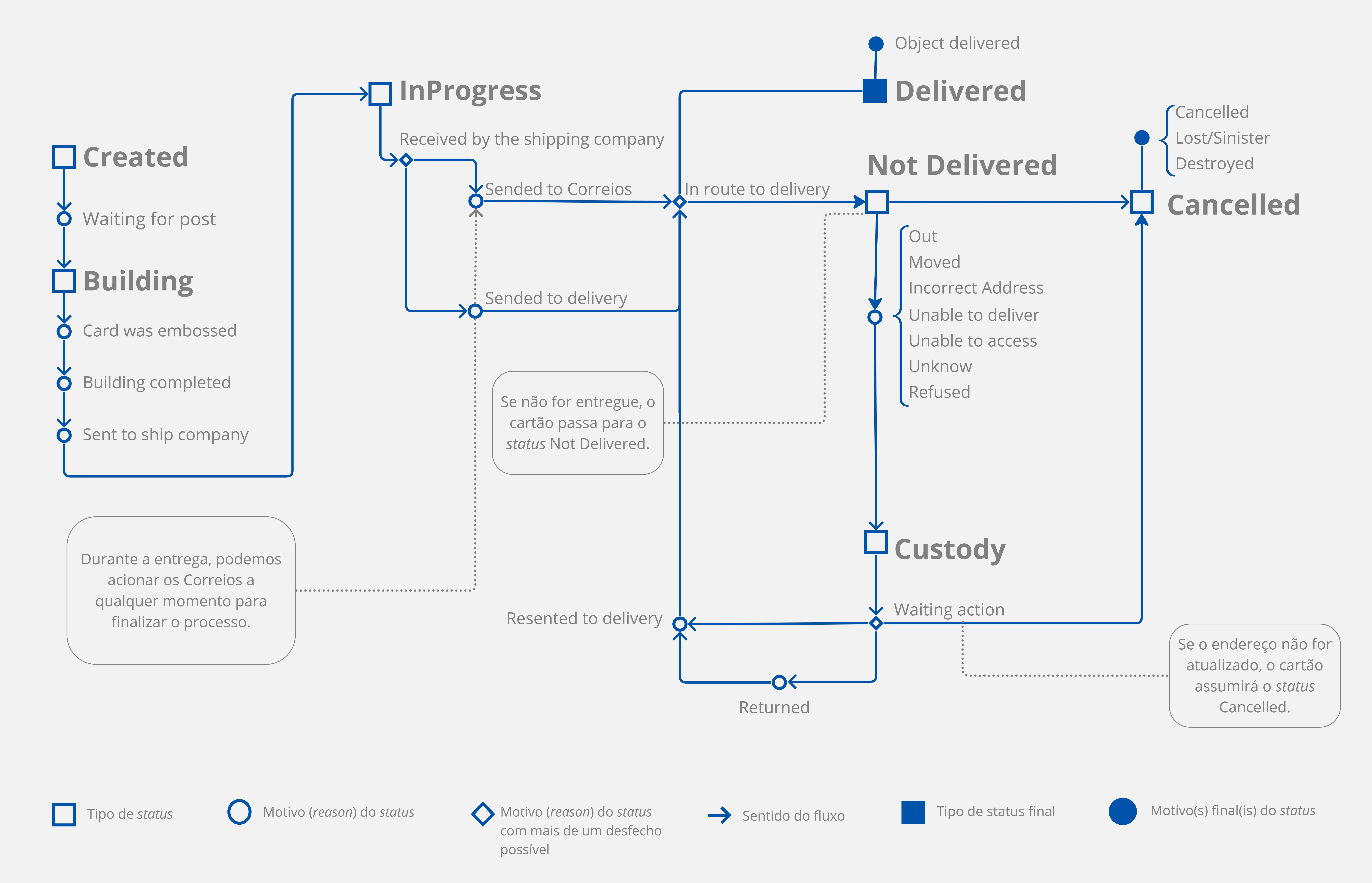 Custody | Situação em que o cartão não foi entregue com sucesso e fica sob custódia da transportadora. Dependendo do contrato entre o parceiro e a transportadora, são realizadas algumas tentativas de entrega até o seu retorno e atualização do endereço de entrega. Verifique as reasons a seguir. |